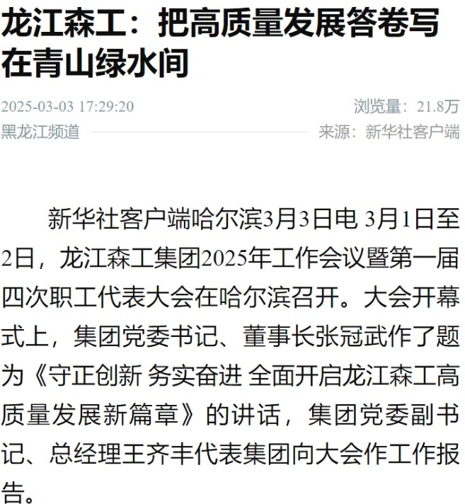 新華社客戶端哈爾濱3月3日電 3月1日至2日,龍江森工集團(tuán)2025年工作會(huì)議暨第一屆四次職工代表大會(huì)在哈爾濱召開。大會(huì)開幕式上,集團(tuán)黨委書記、董事長張冠武作了題為《守正創(chuàng)新 務(wù)實(shí)奮進(jìn) 全面開啟龍江森工高質(zhì)量發(fā)展新篇章》的講話,集團(tuán)黨委副書記、總經(jīng)理王齊豐代表集團(tuán)向大會(huì)作工作報(bào)告。